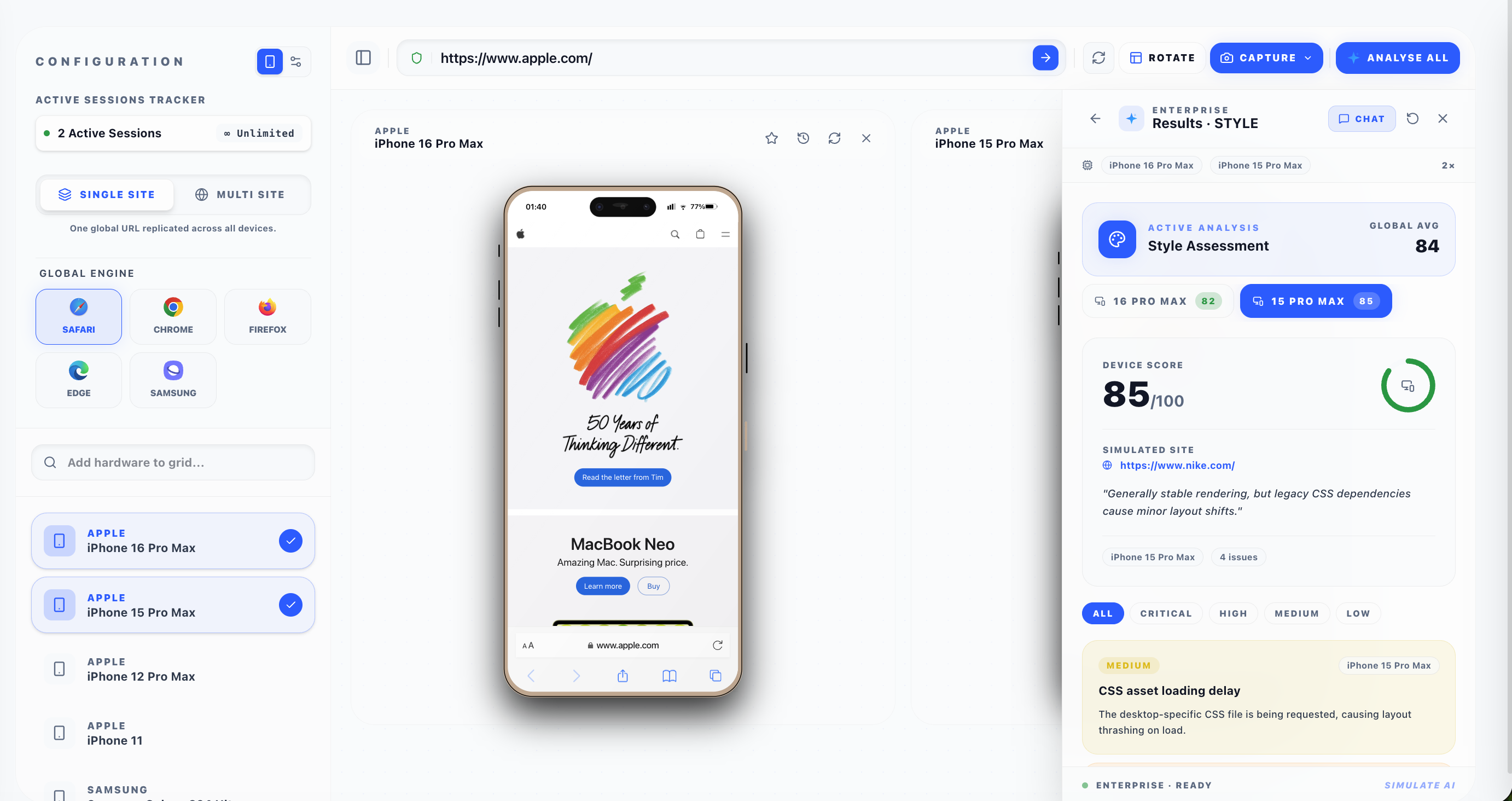 Beyond point-in-time analysis, the Emuluxe AI Engine functions as a collaborative partner. The AI Copilot Chat maintains context of your current device fleet, the page you're testing, and the results of your recent audits.