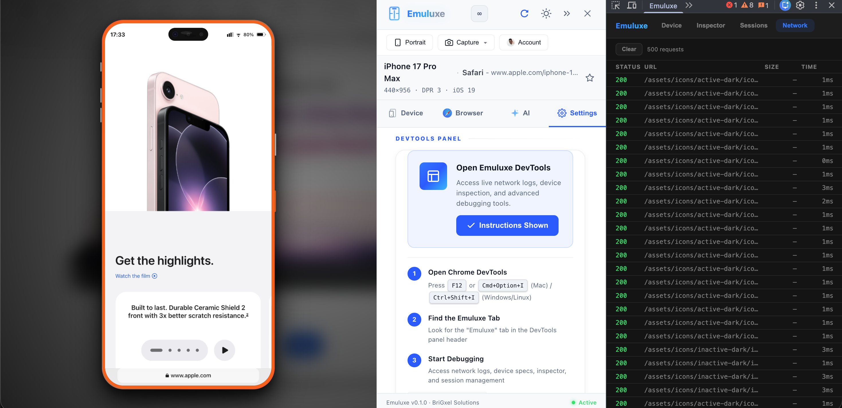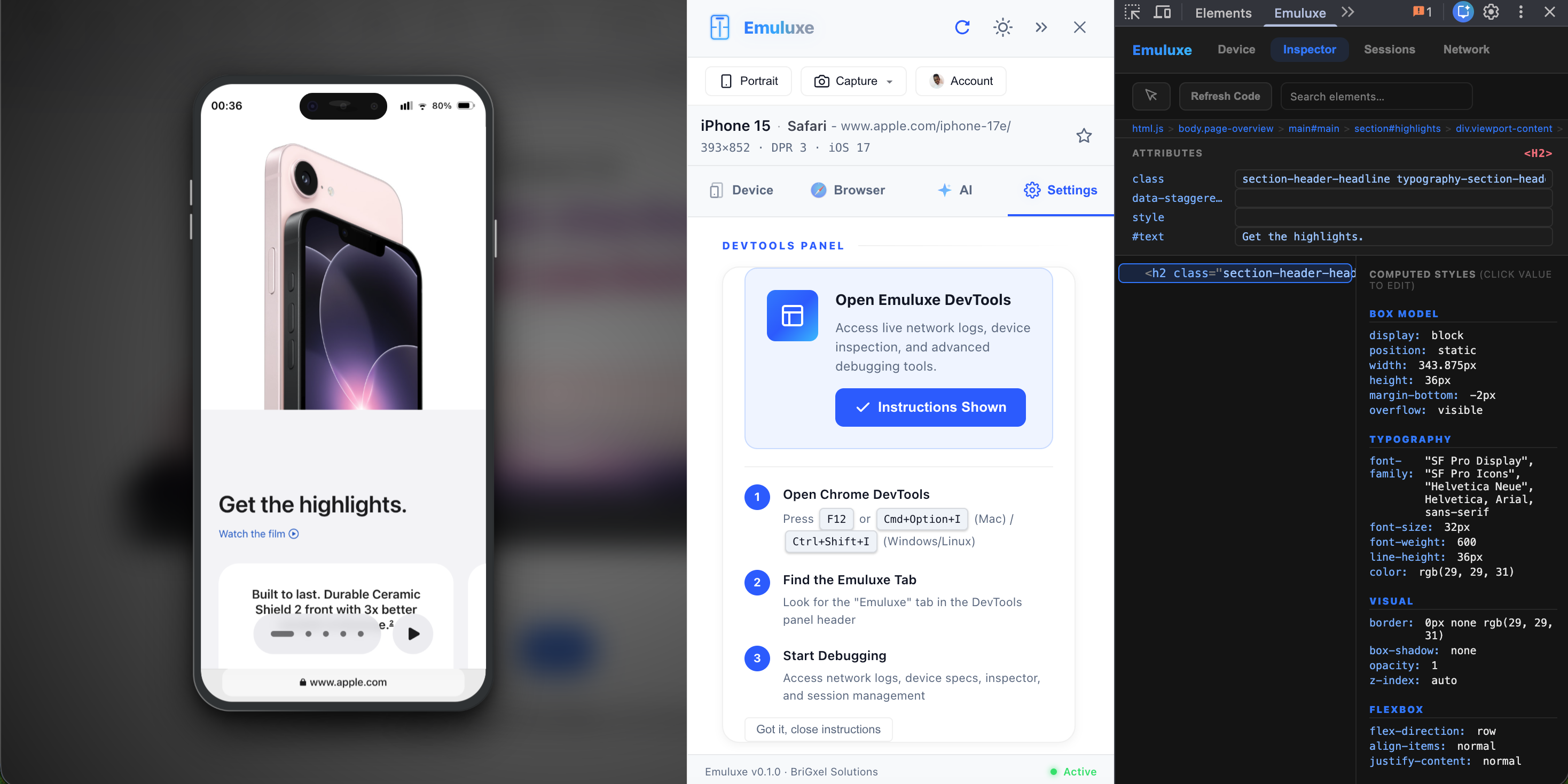 The Emuluxe Devtools Panel provides an integrated suite of diagnostics and controls that live alongside your simulated website. It is designed to mimic the familiarity of Chrome DevTools while adding mobile-specific capabilities.