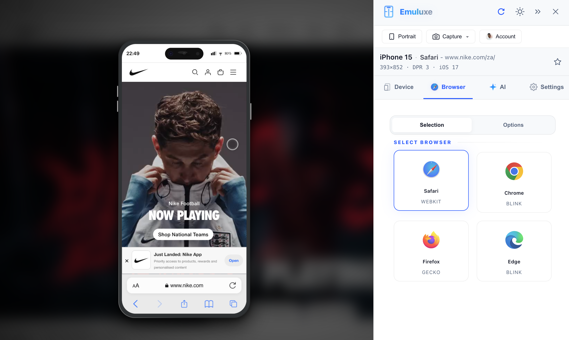 Emuluxe provides the industry's most accurate simulation of the iOS browsing experience. By replicating the specific rendering quirks and UI behaviors of Safari and other Chromium-based browsers on iOS, we ensure your mobile audits are 100% reliable.