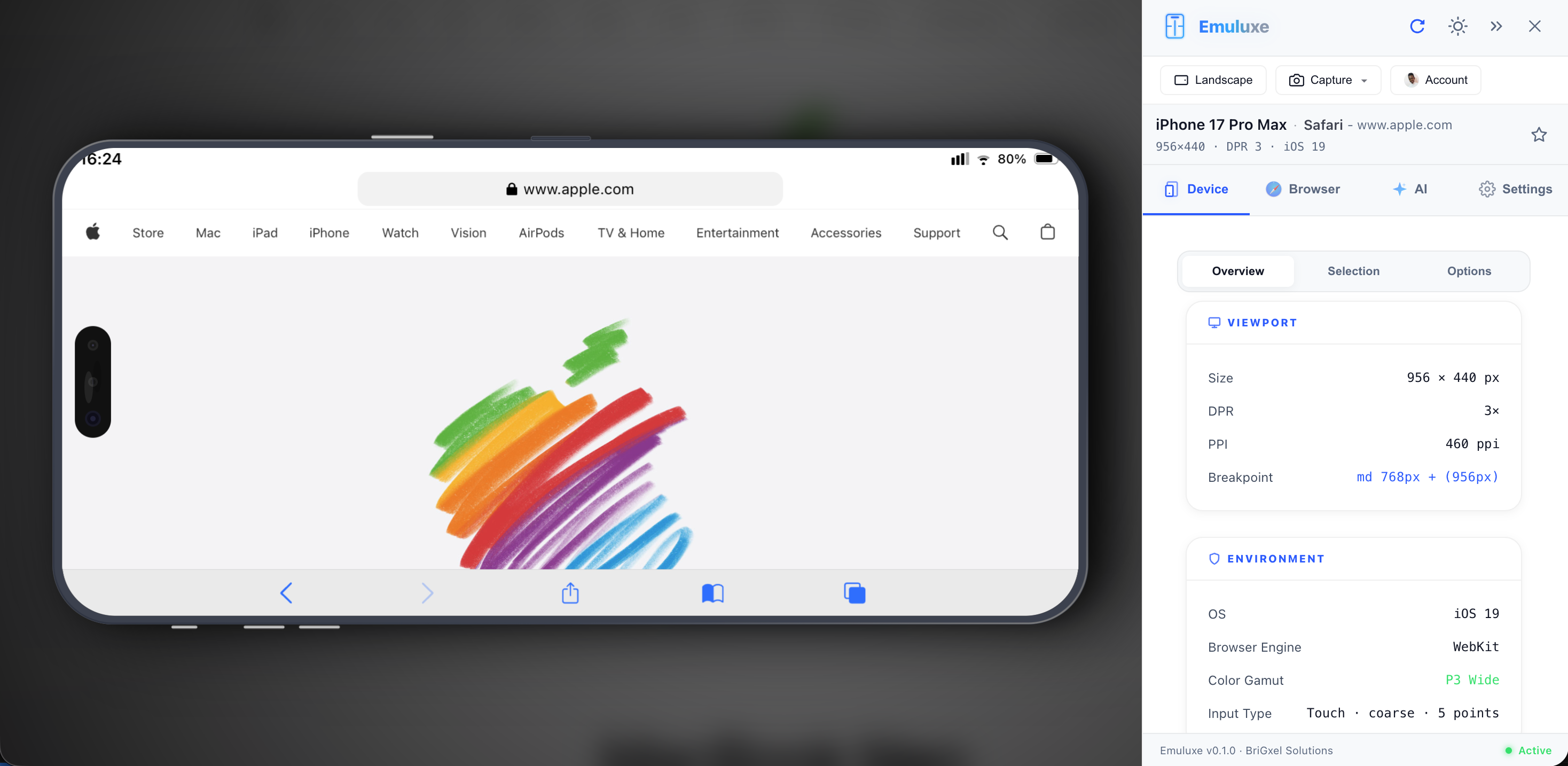 Orientation Toggle provides high-fidelity simulation of physical device rotation. Unlike standard DevTools which simply swap width and height, Emuluxe’s Visual Reflow Engine manages complex layout state and environment variables to ensure a realistic transition.