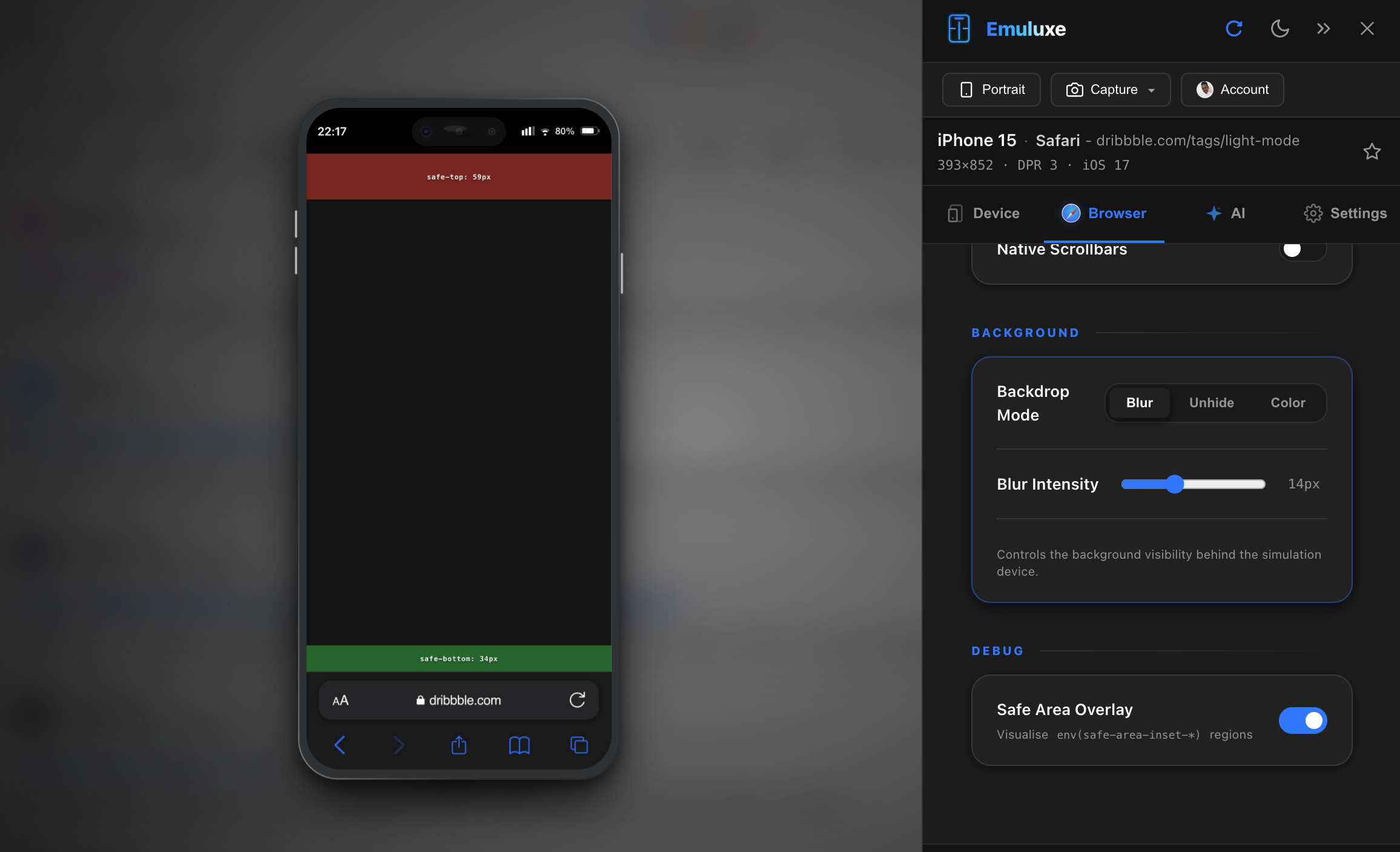 We simulate the behavior of the viewport-fit=cover meta tag. When enabled, your site’s background extends to the device's edges, while Emuluxe manages the safe-area padding to keep critical text and UI elements protected.