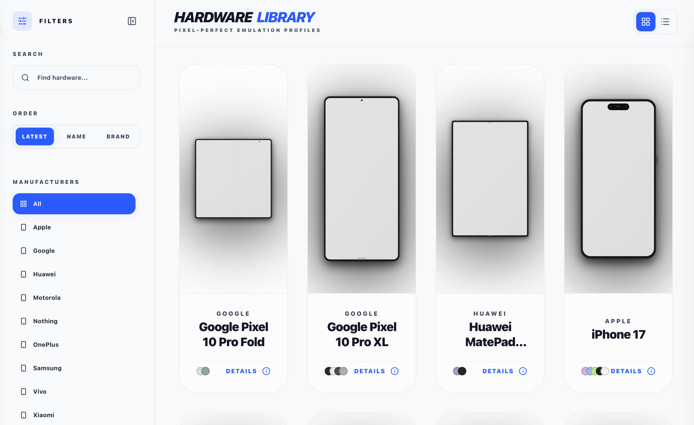 The Foundry is Emuluxe’s comprehensive database of virtual hardware. Unlike standard responsive tools, every device in the Foundry is built from a Physical Hardware Blueprint, ensuring 1:1 behavioral accuracy across screen geometry, pixel density, and kernel-level software signatures.