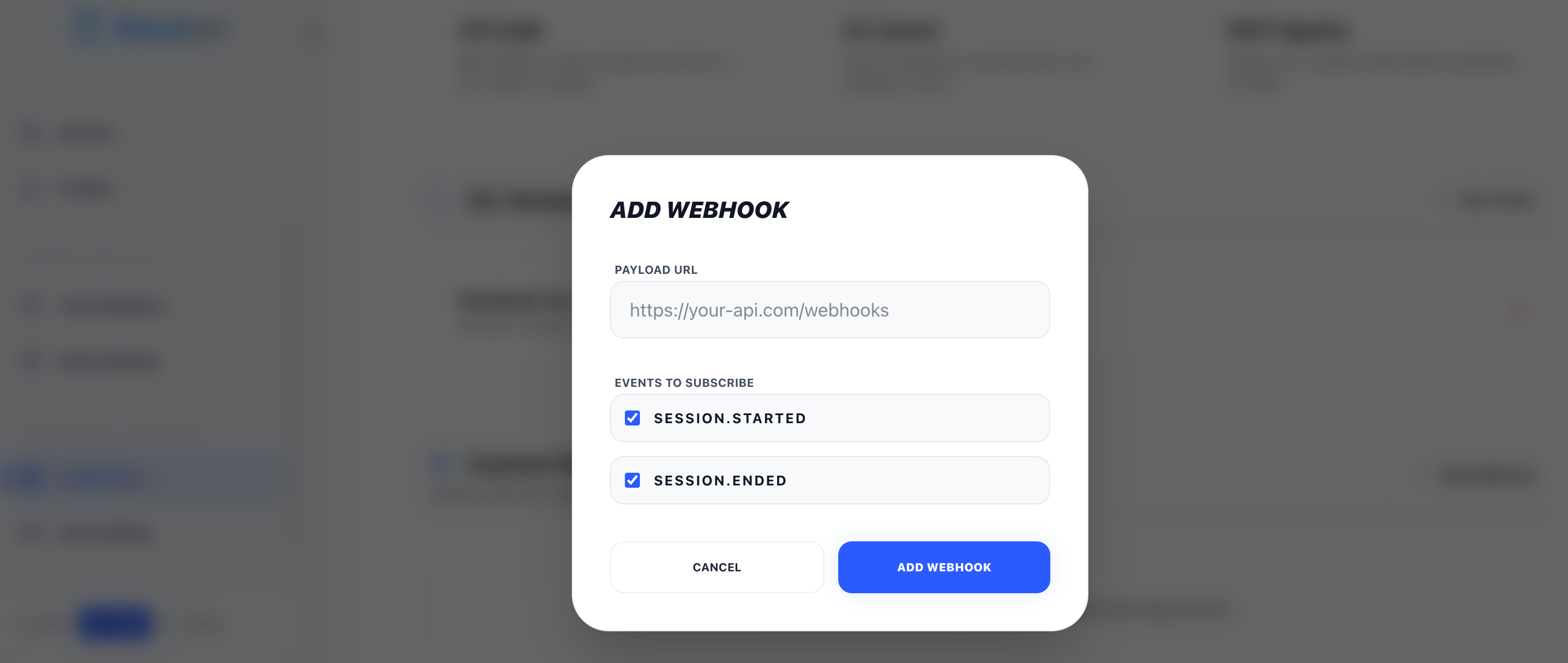 X-Emuluxe-Signature: An HMAC-SHA256 hex digest of the raw request body, signed using your Webhook Secret.X-Emuluxe-Event: The name of the event being dispatched (e.g.,session.started).