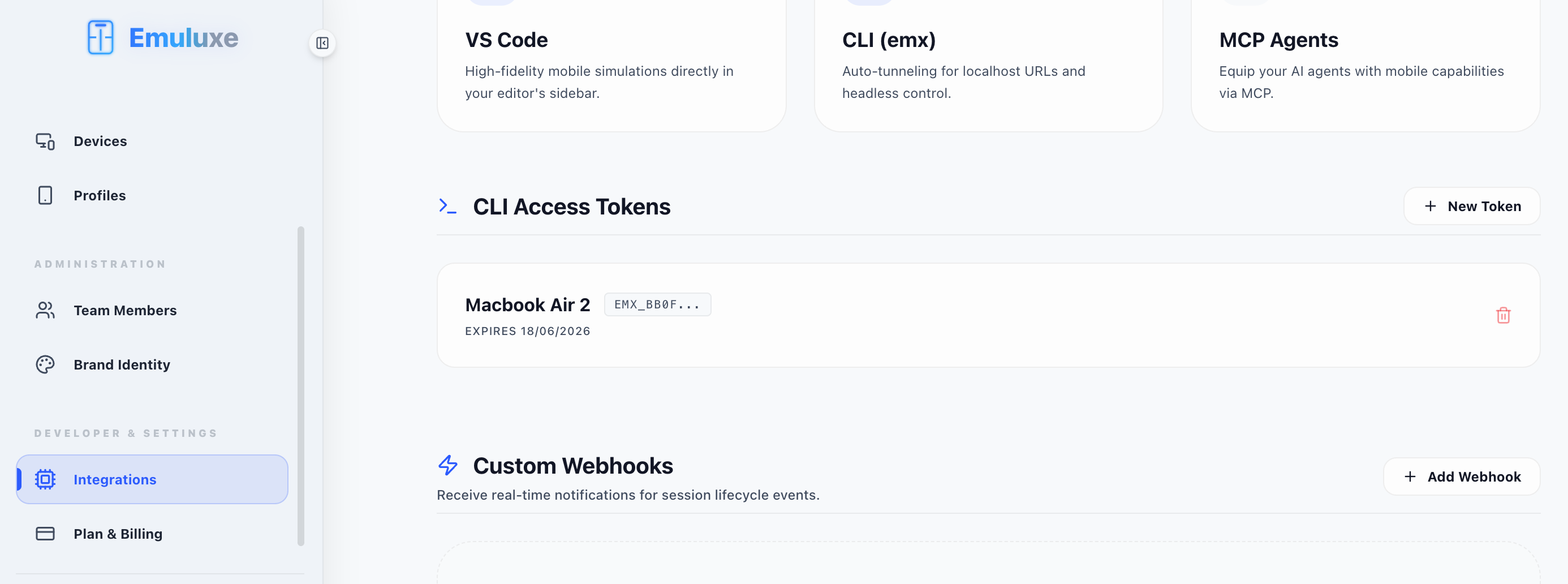 - Navigate to Settings: Go to the Integrations section under your Platform Settings. This is the same hub where you manage your CLI Access Tokens.